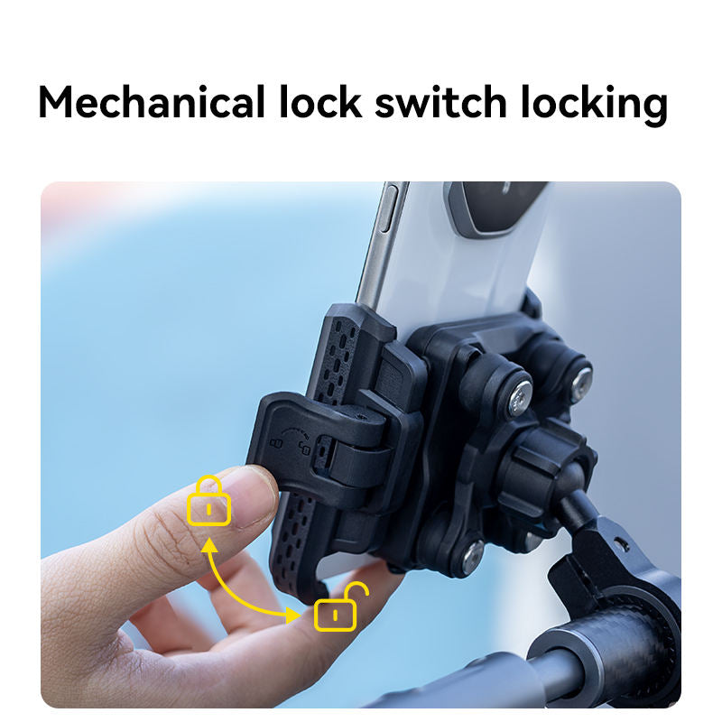 🔒 Mechanical Locking System – Physical lock switch reinforces the clamp arms, preventing loosening from vibration while allowing quick lock and release.