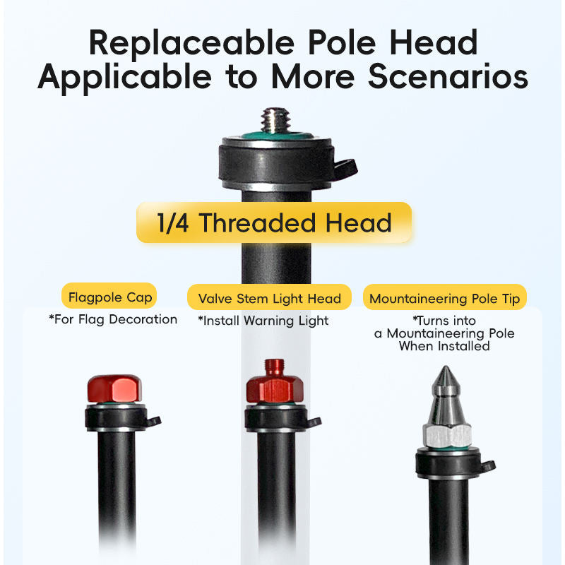 🔁 Replaceable Multi-Function Pole Heads – Interchangeable heads support multiple uses, including flag decoration, warning light installation, mountaineering pole, and sports selfie pole.